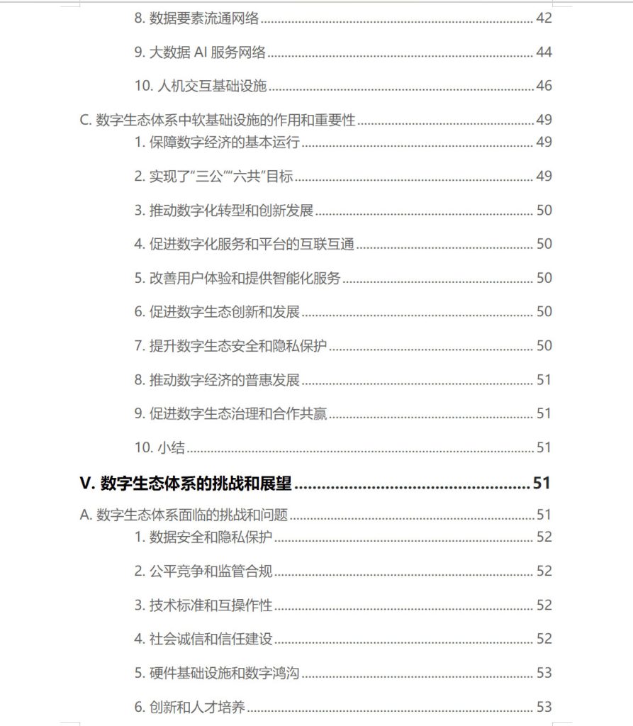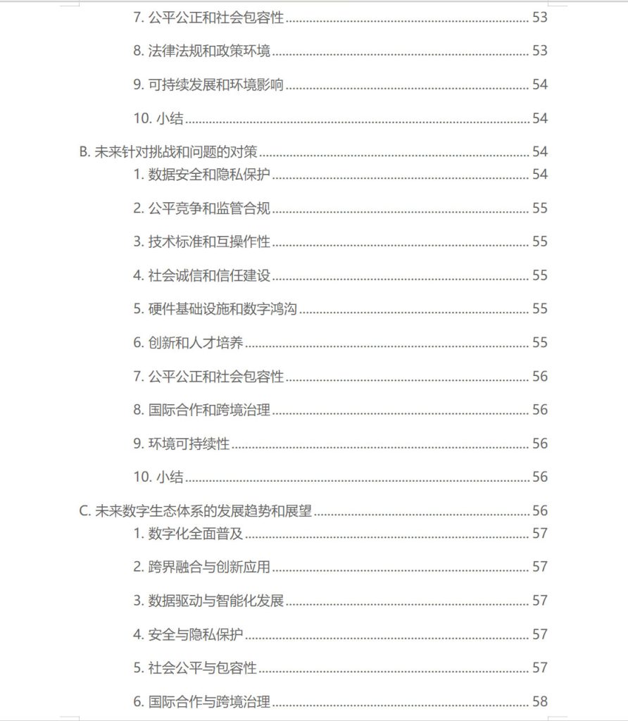 以上仅是数字生态体系面临的挑战和问题的一部分,解决这些挑战和问题需要多方合作,包括政府、企业、学术界、社会组织和个体用户等共同参与。只有通过合作共建、共享、共治,推动数字生态体系的健康发展,才能更好地利用数字技术推动经济社会发展,实现数字化时代的可持续发展目标。