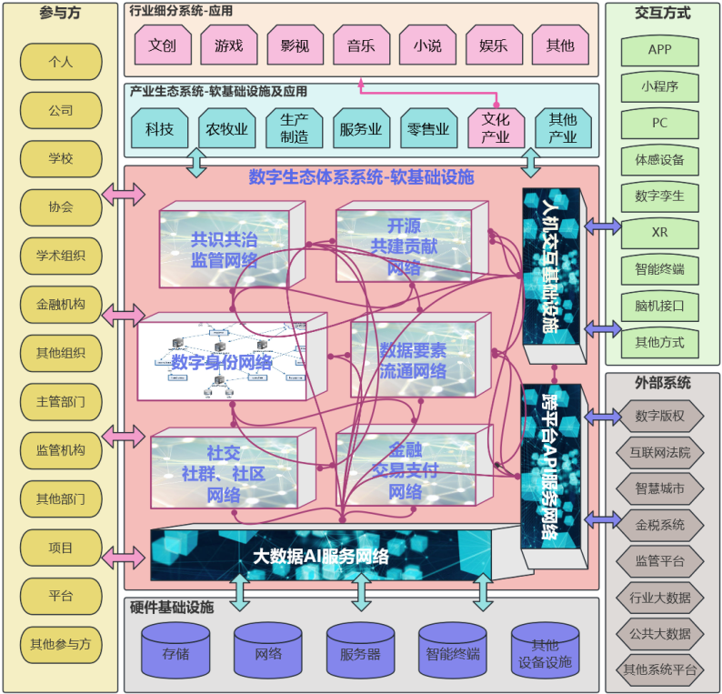 数字生态体系中的软基础设施是支撑数字经济运行和发展的重要基础,应该加强数字身份网络、共识共治监管网络、社交网络、金融交易支付网络、跨平台API服务网络、开源共建贡献网络、数据要素流通网络、大数据AI服务网络和人机交互基础设施等方面的建设,提供稳定、安全、高效的服务。